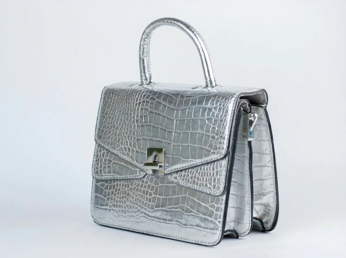 Sa texture crocodile embossée et sa finition argentée miroir lui confèrent une allure luxueuse et contemporaine.