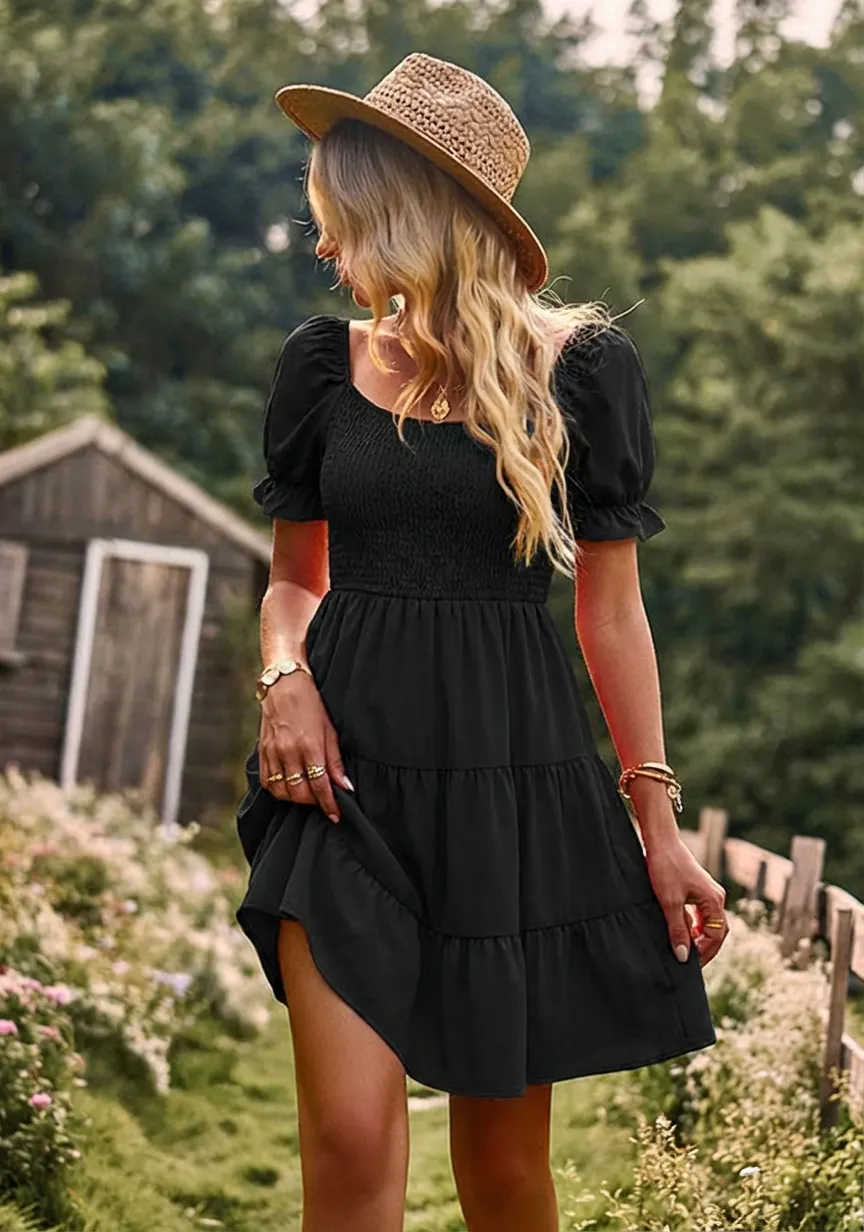 Son corsage smocké épouse le buste avec souplesse, tandis que les manches bouffantes et la jupe à volants dessinent une silhouette contemplative et affirmée.