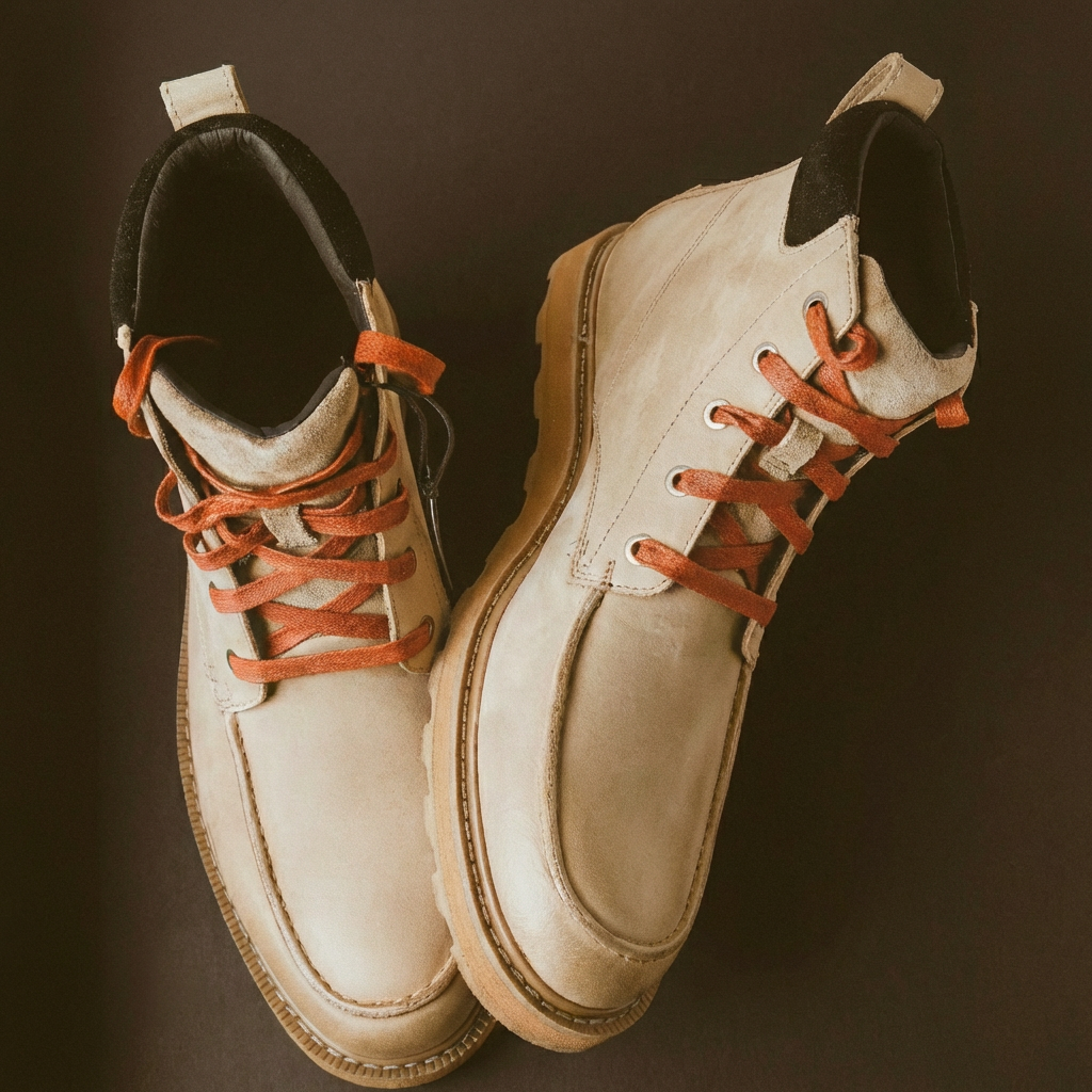 Le Boot Beige Contrasté Zéphyr allie fonctionnalité outdoor et esthétique affirmée. Confectionné en cuir beige à la finition mate, ce modèle se distingue par ses lacets rouges éclatants, son col rembourré noir et sa semelle crantée robuste pensée pour l’adhérence et le confort. Chaque détail évoque une allure dynamique, entre esprit baroudeur et style urbain.