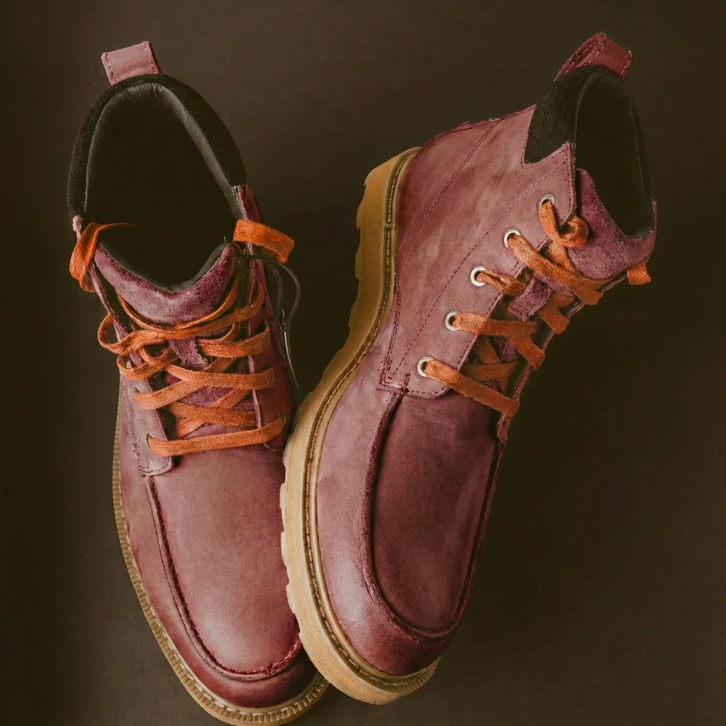 incarne l’audace maîtrisée. Confectionné en cuir bordeaux à la patine subtile, ce modèle se distingue par ses lacets orange-brun, ses œillets métalliques et son col rembourré noir pour un confort renforcé. Sa semelle crantée couleur sable assure une adhérence optimale et une allure affirmée.