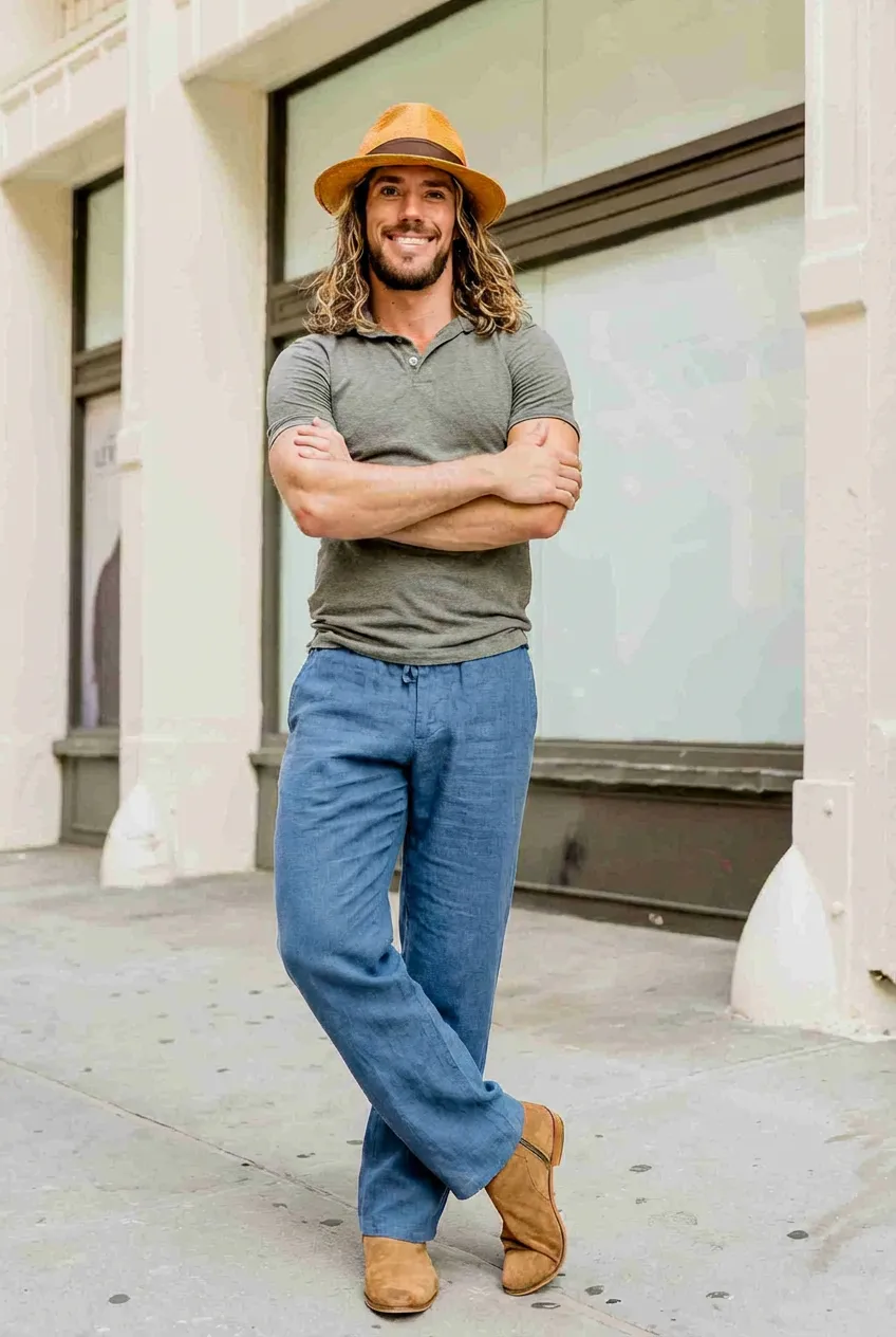 Le Pantalon Bleu Sillage Urbain incarne la fluidité du mouvement et l’élégance décontractée. Confectionné dans une matière souple et respirante, il offre une coupe ample et droite qui accompagne le corps sans le contraindre. Sa teinte bleu profond contraste subtilement avec les chaussures en suède sable et le polo gris, pour une silhouette à la fois naturelle et affirmée.